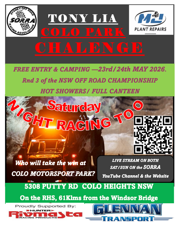 Sydney Off Road Racing Association runs many different events every year, which includes Off Road Racing, Driver Training, Khanacross, Autocross, State Events and the famous Ray Vestey Memorial.